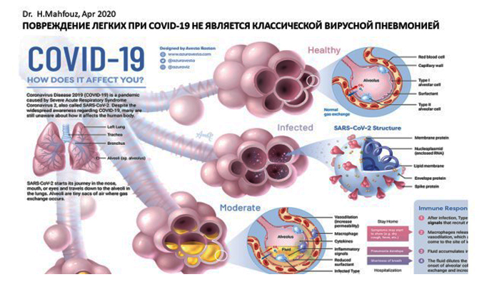 Аналогичного мнения придерживается доктор Hany Mahfouz. По его мнению COVID-19 не вызывает тяжелой вирусной пневмонии и острого респираторного дистресс синдрома (ОРДС), как первоначально предполагалось.